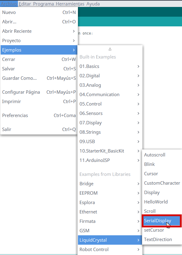 Y ya está configurada la placa. Ahora podemos coger uno de los numerosos ejemplos que tenemos para poder cargar un programa y ver cómo todo funciona correctamente. En este caso vamos a coger el ejemplo de una pantalla LCD 16x2: