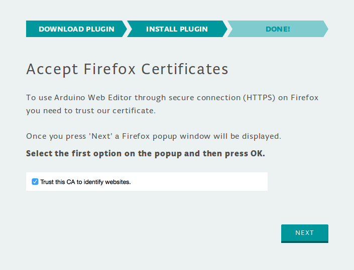 Si usamos Firefox deberemos aceptar los certificados de la página de Arduino (Recuerda desbloquear cualquier ad-blocker que tengas instalado y activar los pop ups para la página de arduino)