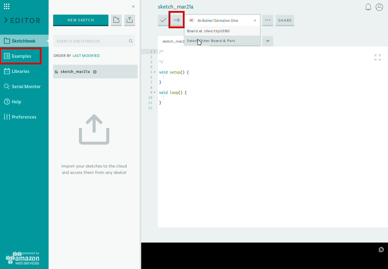 Ahora, de la misma manera que hacemos con el Arduino IDE, seleccionamos la placa  y el puerto que queremos usar. Podemos ver que tenemos el botón para cargar el programa de manera similar que el Arduino IDE. Además podemos cargar Ejemplos (Examples) ya programados en nuestra placa para probar el buen funcionamiento. En nuestro caso vamos a probar el ejemplo básico "blink".