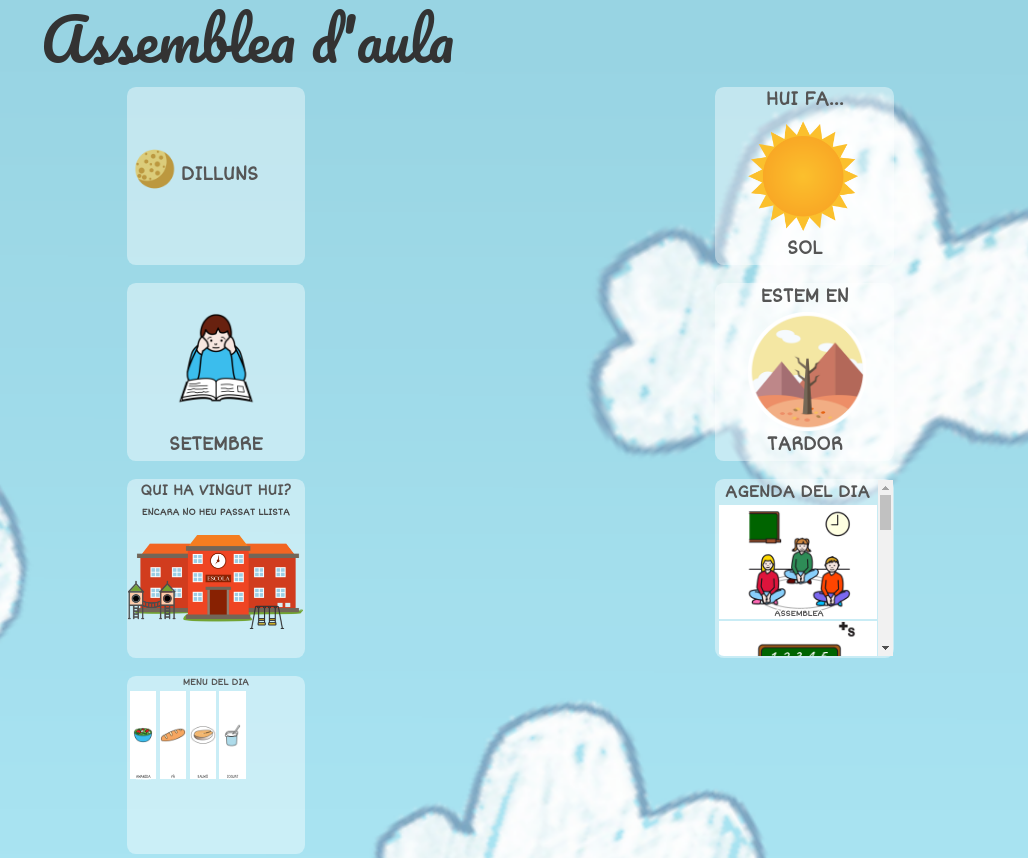 Asamblea es un desarrollo del equipo LliureX en colaboración con la comunidad educativa, pensado para facilitar la tarea que se realiza en los centros. De esta manera pasar lista, conocer las estaciones del año, el día de la semana, el menú del día... se vuelve en un momento interactivo que junto con una pantalla o pizarra digital ayuda a los alumnos a comprender de una manera amena todos estos conceptos. La herramienta es rediseñable y ajustable al profesorado gracias a su método de edición, además posee un método de backup para generar copias de seguridad o bien reutilizar nuestro modelo predefinido de asamblea en otros equipos.