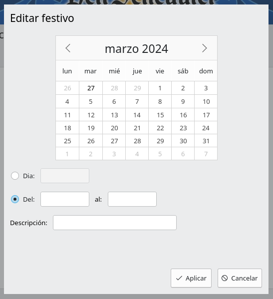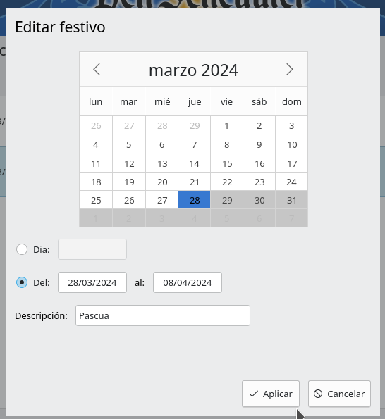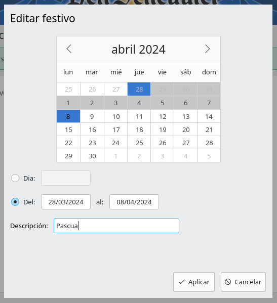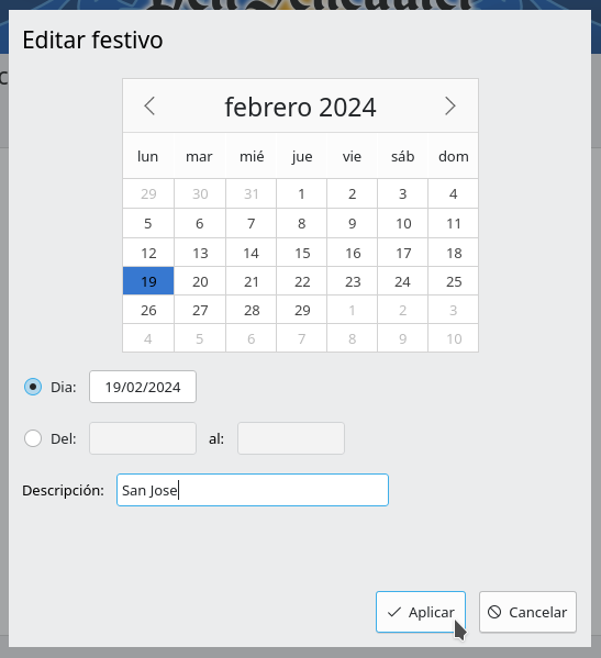 Para guardar los cambios se hará clic sobre Aplicar. El formulario se cerrará y la fecha seleccionada se mostrará en la lista de días.