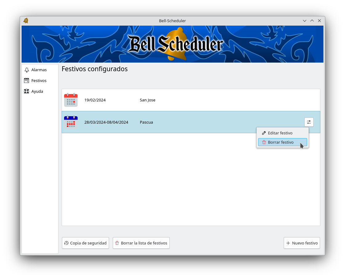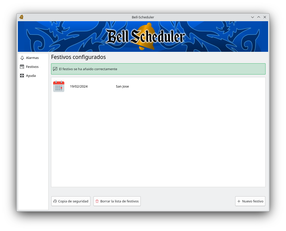 Desde Bell Scheduler se puede gestionar una lista de días “festivos” para los que las alarmas programadas no sean ejecutadas esos días (siempre y cuando esté activada esta opción tal como se indica en el apartado 5).