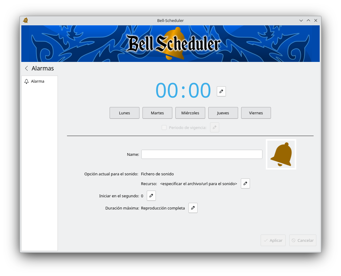 Bell Scheduler es una aplicación destinada a programar las alarmas que marcan los momentos de inicio de clase, recreo, salida... reproduciendo el sonido que se haya asociado a cada alarma. La aplicación se puede instalar en cualquier ordenador LliureX conectado al equipo de sonido del centro, utilizando el zomando existente en la sección "Software" del Centro de Control de LliureX (Zero Center):