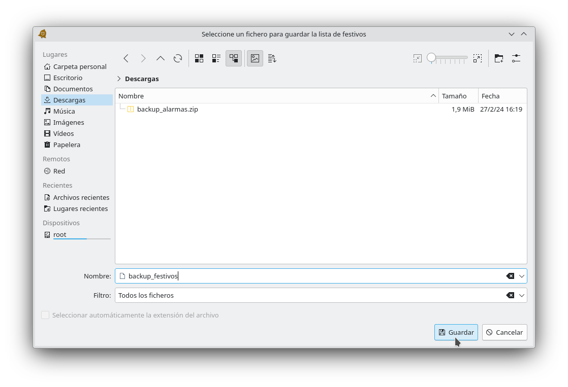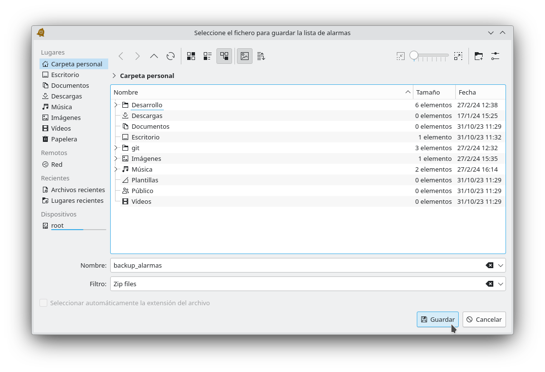 Se mostrará un cuadro de diálogo para indicar la ruta y el nombre del fichero que se va a crear con la configuración de las alarmas
