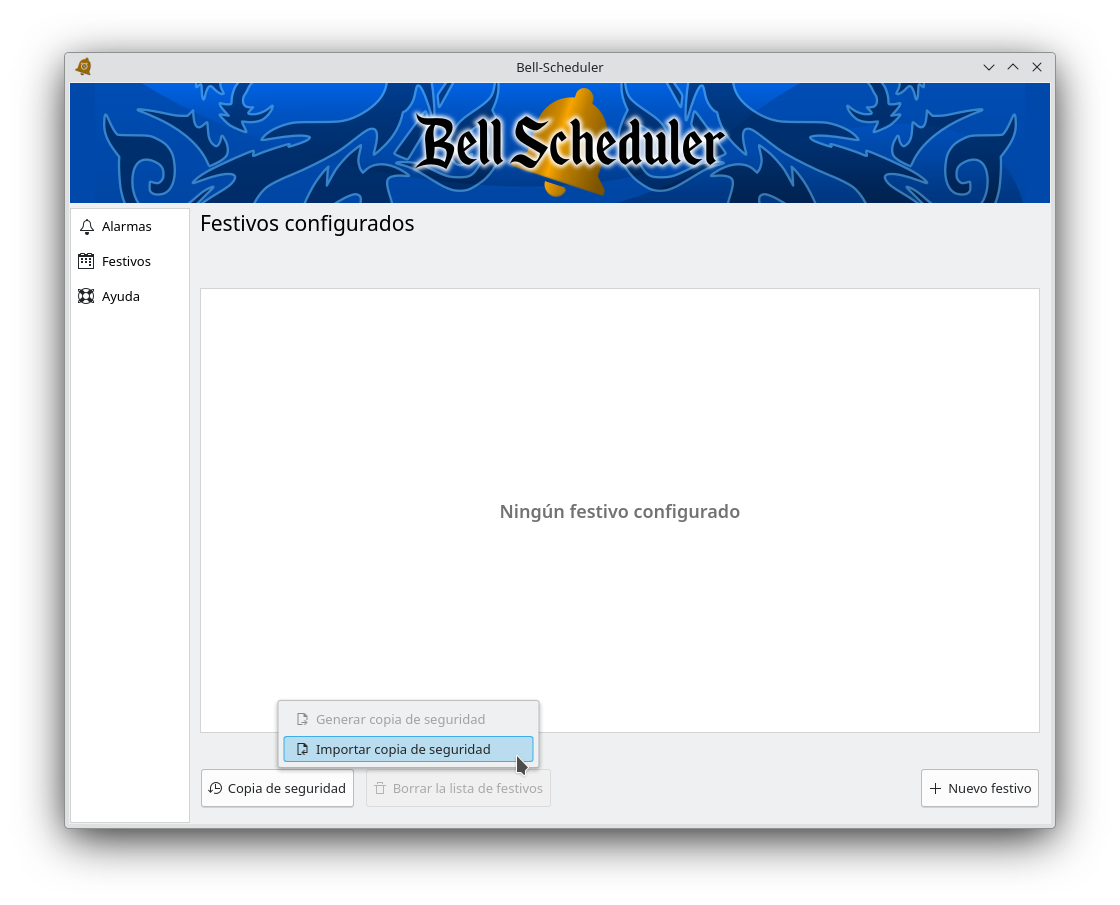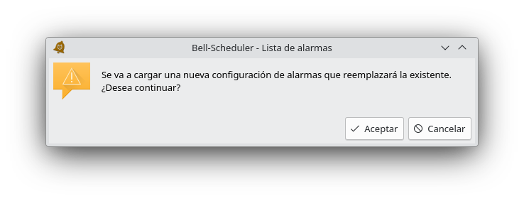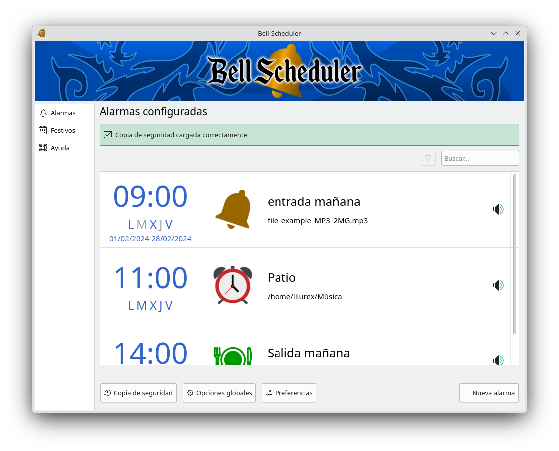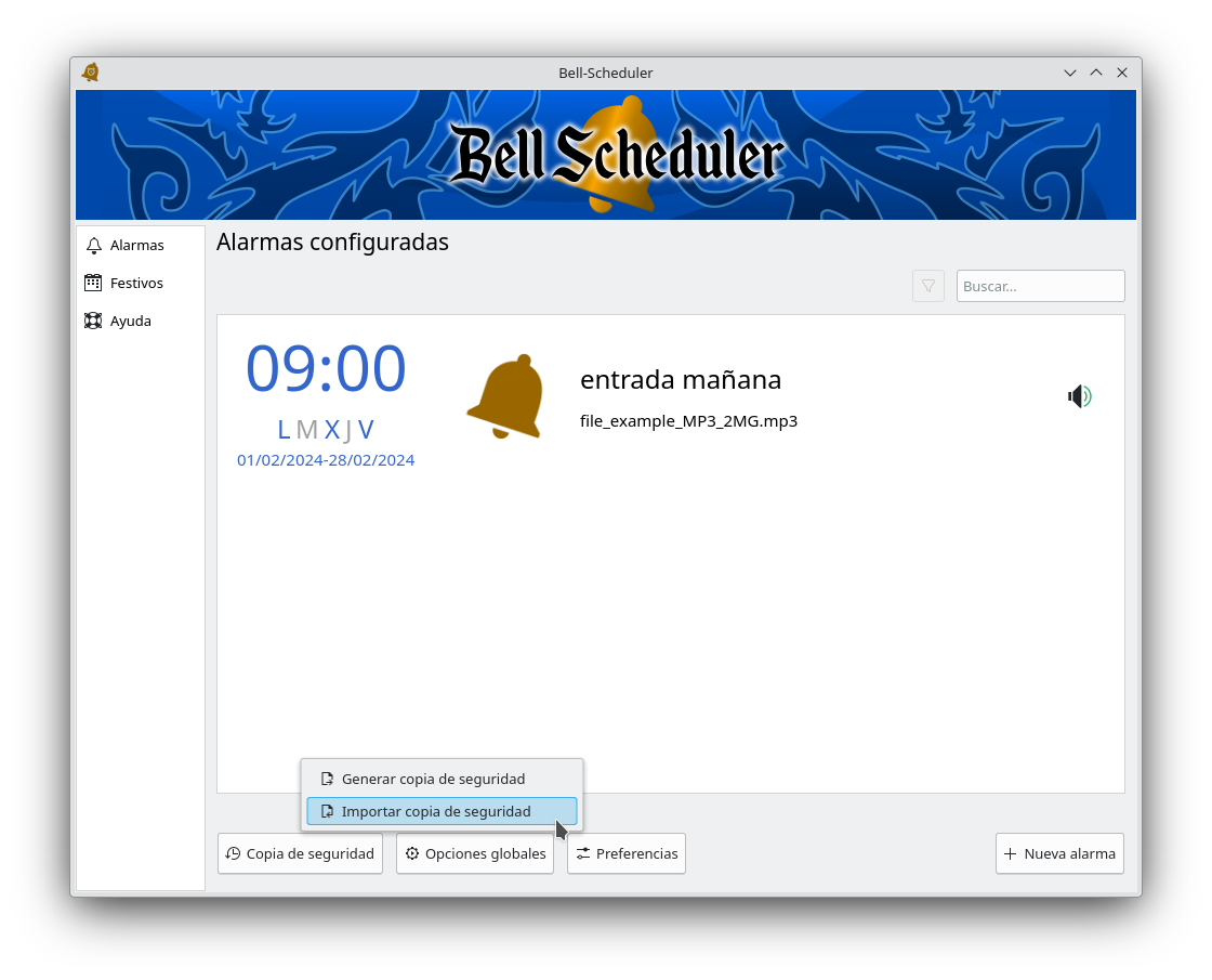 Otra de las funcionalidades que ofrece Bell-Scheduler es la posibilidad de cargar una configuración de alarmas (previamente generada y exportada por la aplicación), de forma que ante un problema en el equipo se pueda restaurar rápidamente la programación de alarmas realizada.