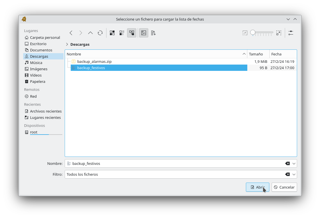 Tras aceptar la acción aparecerá un cuadro de diálogo para seleccionar el archivo con la lista de días que se quiere cargar