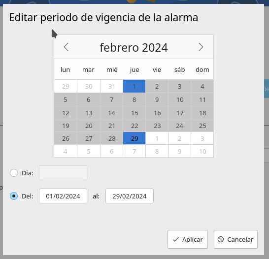 - Periodo de vigencia (opcional): Esta opción permite indicar el periodo de vigencia (una fecha o un rango de fechas) durante el cual a la hora y día(s) marcados será reproducida la alarma. De esta forma se facilita que al inicio de curso puedan programarse todas las alarmas del año.