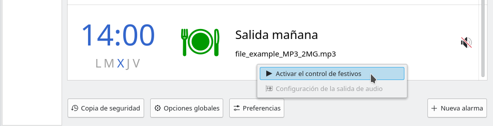 Una vez activada esta opción, las alarmas programadas ya no serán ejecutadas los días festivos. Si se desea desactivar esta opción basta con volver a hacer clic sobre el botón.