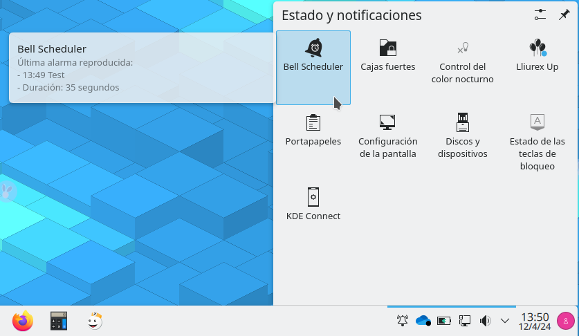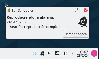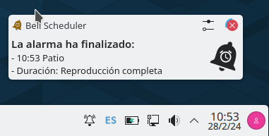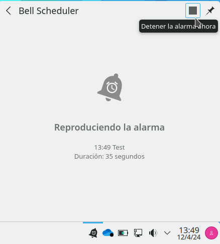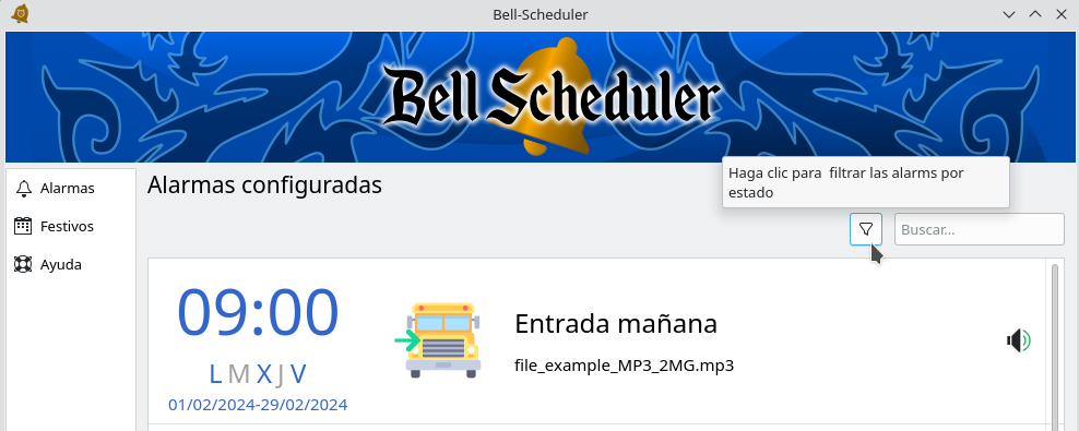 Situando el cursor sobre el icono del Bell-Scheduler se mostrará la información sobre la última alarama reproducida.