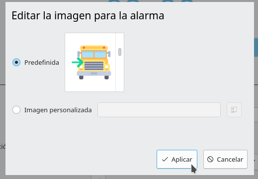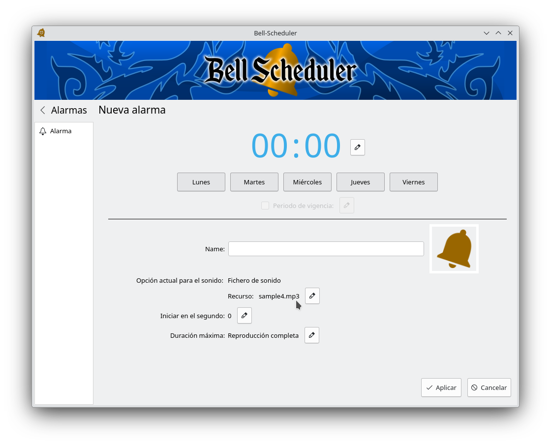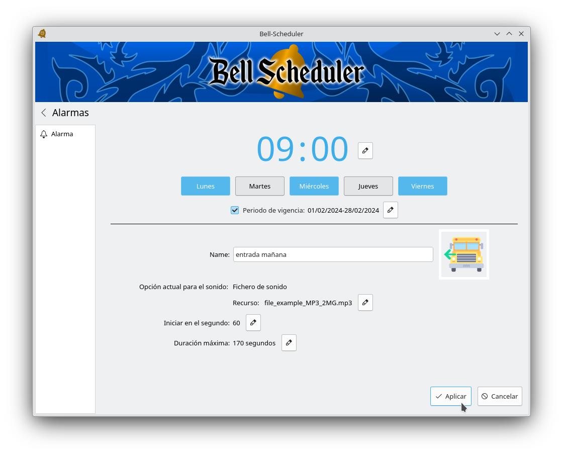 Se puede asociar una imagen de la lista que ofrece Bell Scheduler u otro fichero seleccionado por el usuario