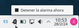 Para saber cual ha sido la última alarma reproducida durante la sesión, se puede acceder a Estados y notificaciones haciendo clic sobre el icono correspondiente de la barra de menú