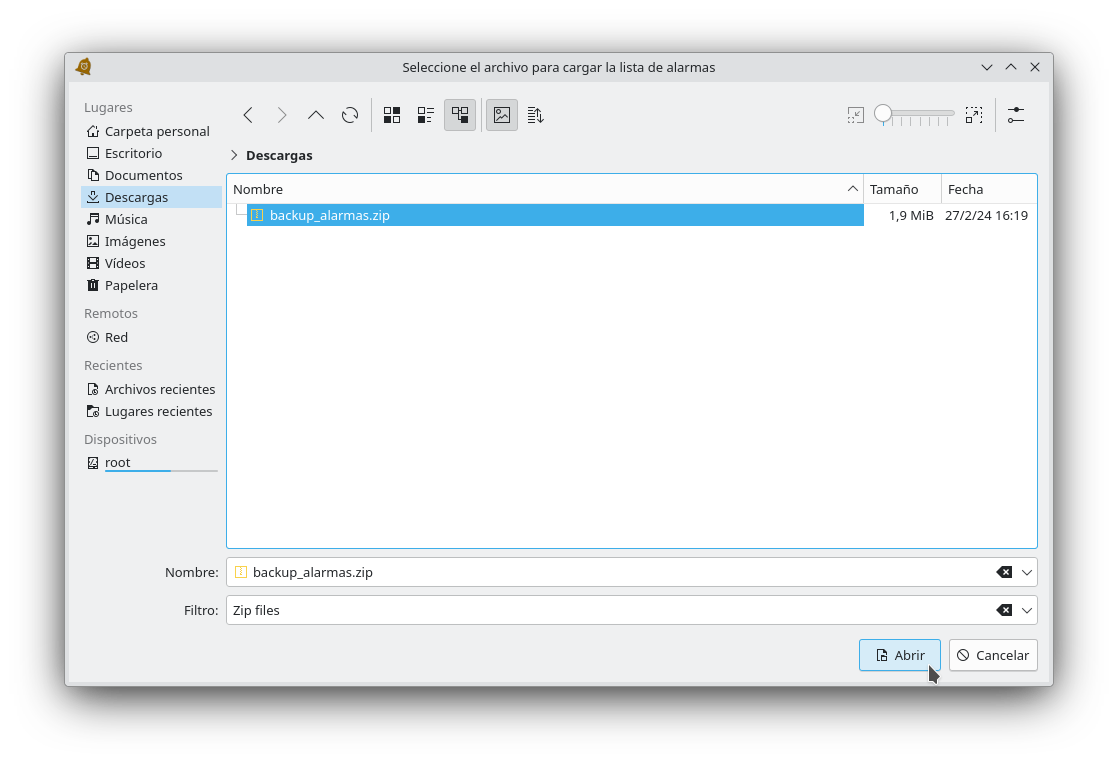 Tras confirmar que se quiere realizar la carga de una configuración (que como se ha indicado sustituirá a la existente) se mostrará un cuadro de diálogo para seleccionar el archivo .zip con la configuración de las alarmas