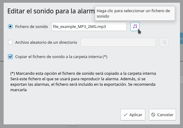 En el caso de seleccionar la opción "Fichero de sonido" , después de seleccionar el fichero correspondiente se activará la opción "Copiar fichero de sonido a carpeta interna". Mediante esta opción se puede indicar al Bell-Scheduler que el fichero de sonido sea copiado o no a una carpeta interna de la aplicación.