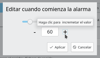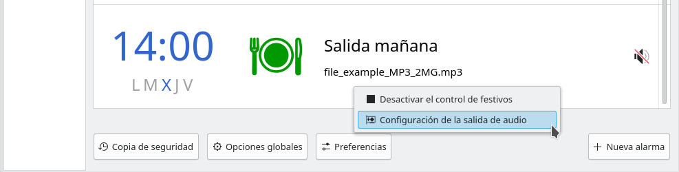 La opción para activar o desactivar la alarma sólo estará disponible si se dan las condiciones para que pueda modificarse este estado: que la alarma este programada para al menos un día y que el archivo de sonido o la carpeta para seleccionar archivos de forma aleatoria estén disponibles en el equipo