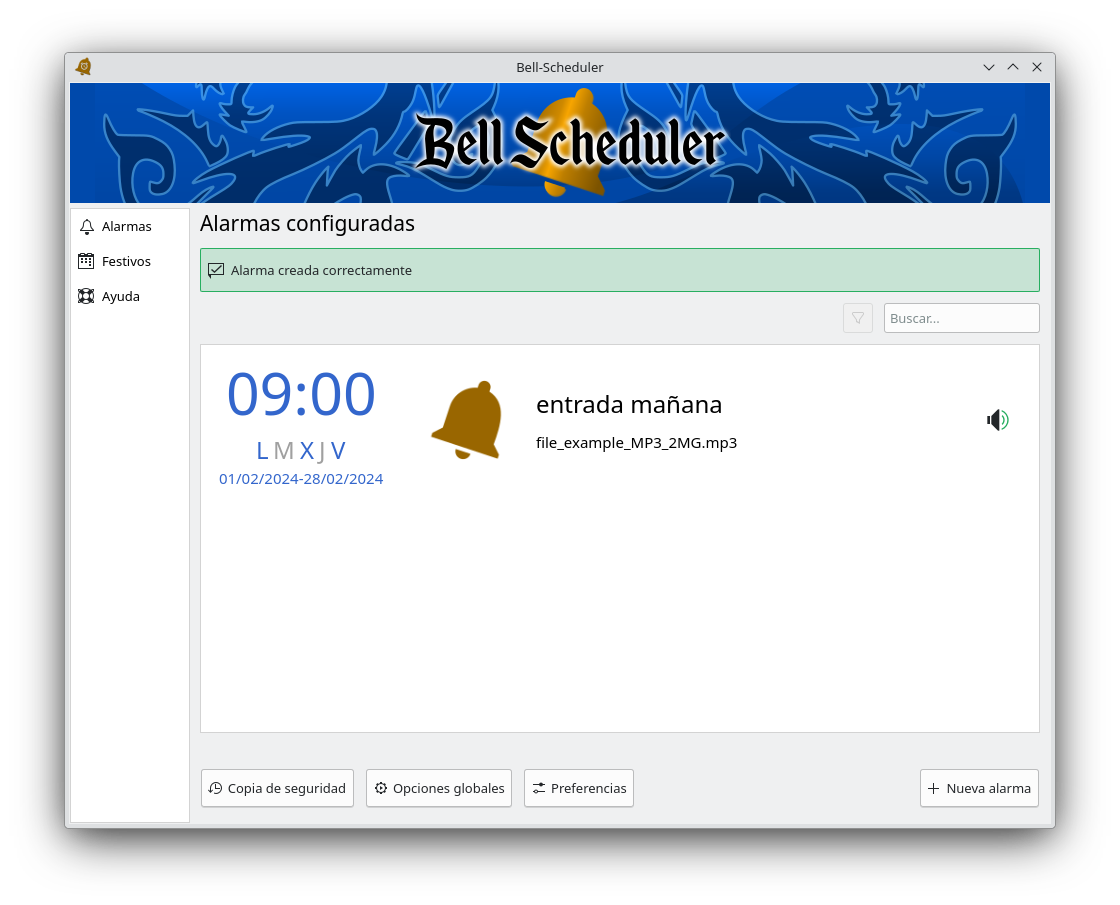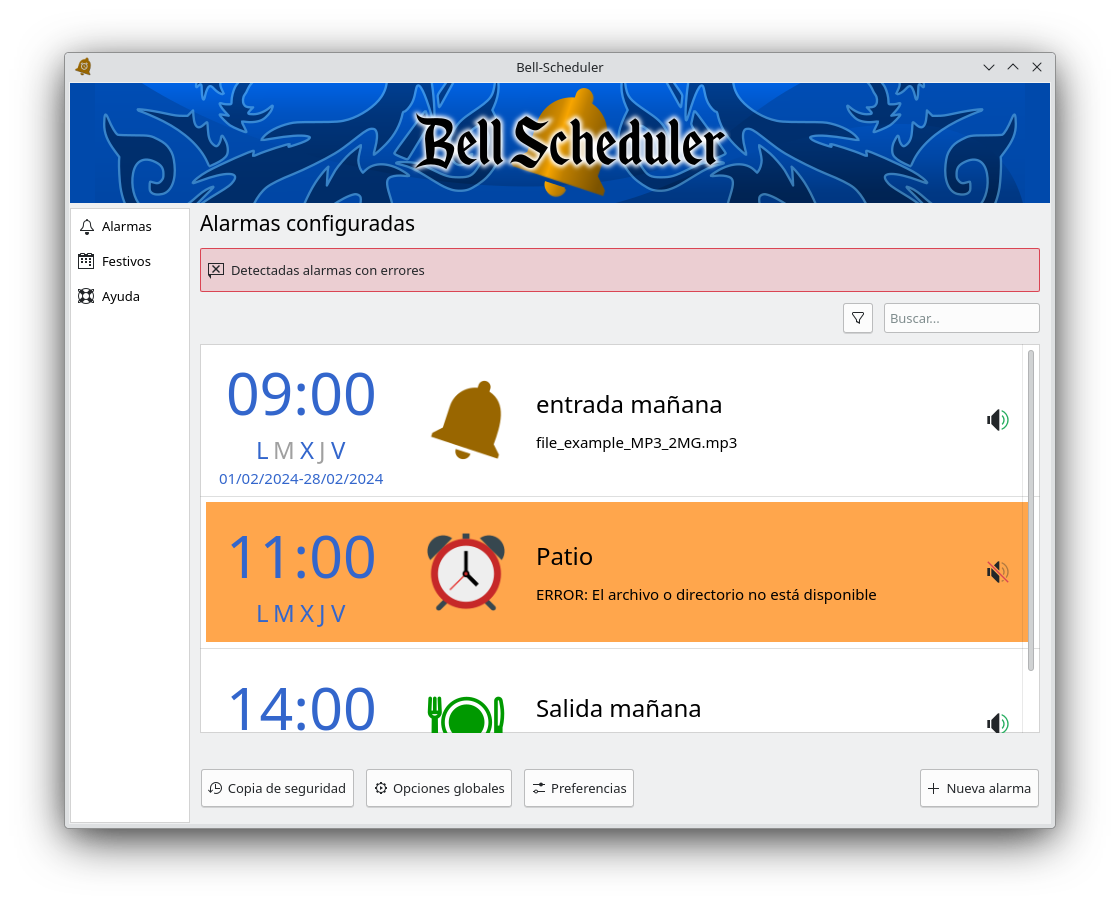 Bell-Scheduler incluye varias opciones para la gestión global de las alarmas que permiten: