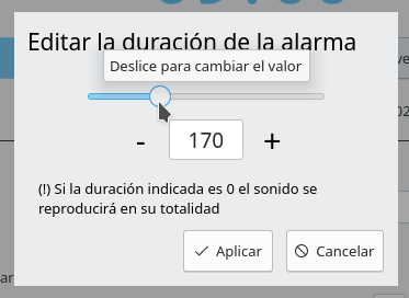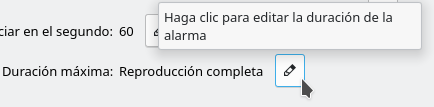 Si la duración indicada para la alarma es 0 el archivo de sonido asociado (o seleccionado aleatoriamente de una carpeta) o la Url se reproducirá en su totalidad