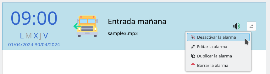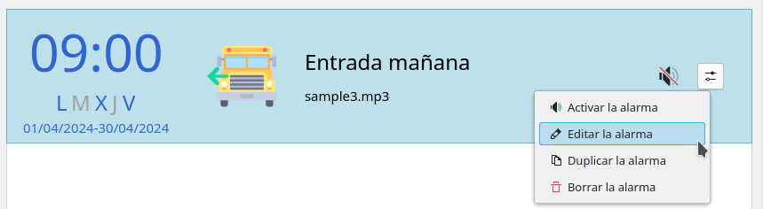 Una vez creada la alarma es posible editarla, activarla/desactivarla y borrarla.