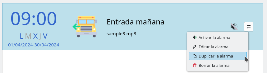 - Duplicar la alarma: permite crear una alarma a partir de otra ya configurada, agilizando de esta forma la creación de alarmas. Una vez duplicada es posible modificar los datos necesarios. Si al guardar los cambios se detectan que ya hay alarmas programadas para el mismo periodo se mostrará un mensaje de alerta.