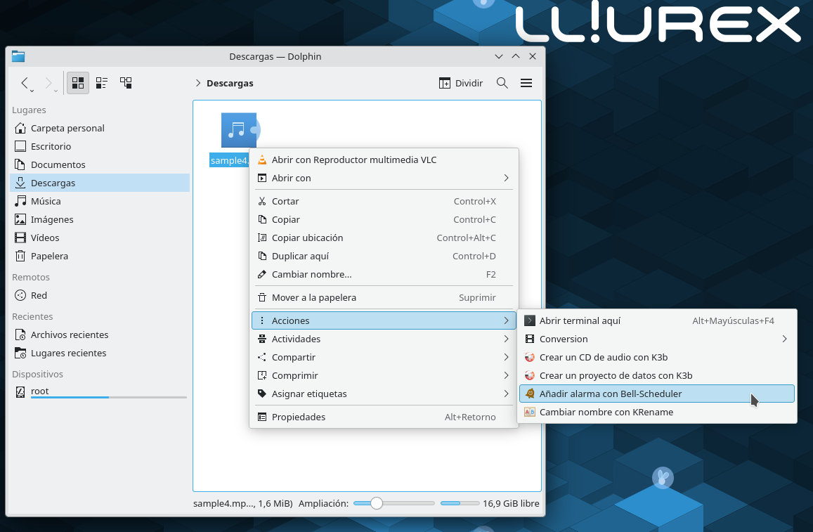 Si se hace clic con el botón derecho del ratón sobre un archivo de audio/vídeo con la opción Añadir alarma con Bell-Scheduler, es posible dar de alta una alarma que usará el archivo seleccionado.