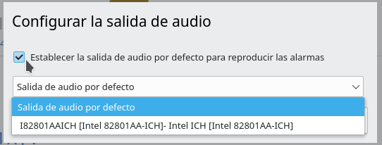 Si el equipo donde esta instalado Bell-Scheduler dispone de varias salidas de audio es posible establecer cual de ellas será usada para reproducir las alarmas de forma que la salida de audio configurada coincida con la salida a la que esta conectada el equipo de megafonía.