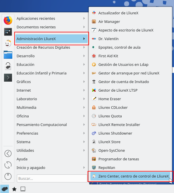 Para iniciar el asistente de sabores vamos a Inicio > Administración de LliureX > Zero Center y seleccionamos el sabor que queremos: