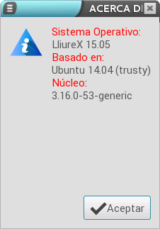 Tras pulsar la opción, se muestra un diálogo donde nos indica la versión de LliureX, el sistema operativo, la versión en la que está basado, y la versión del núcleo.