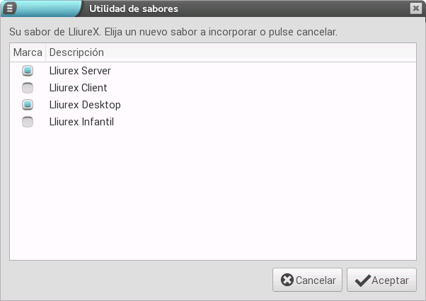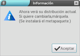 A continuación, tenemos que seleccionar la nueva adaptación que queremos instalar y pulsar el botón Aceptar. Tras realizar la pulsación, se instalan los metapaquetes correspondientes a los sabores que se han seleccionado. En caso de detectar algún tipo de incompatibilidad (como por ejemplo entre servidor y cliente), la aplicación muestra un mensaje indicándolo.