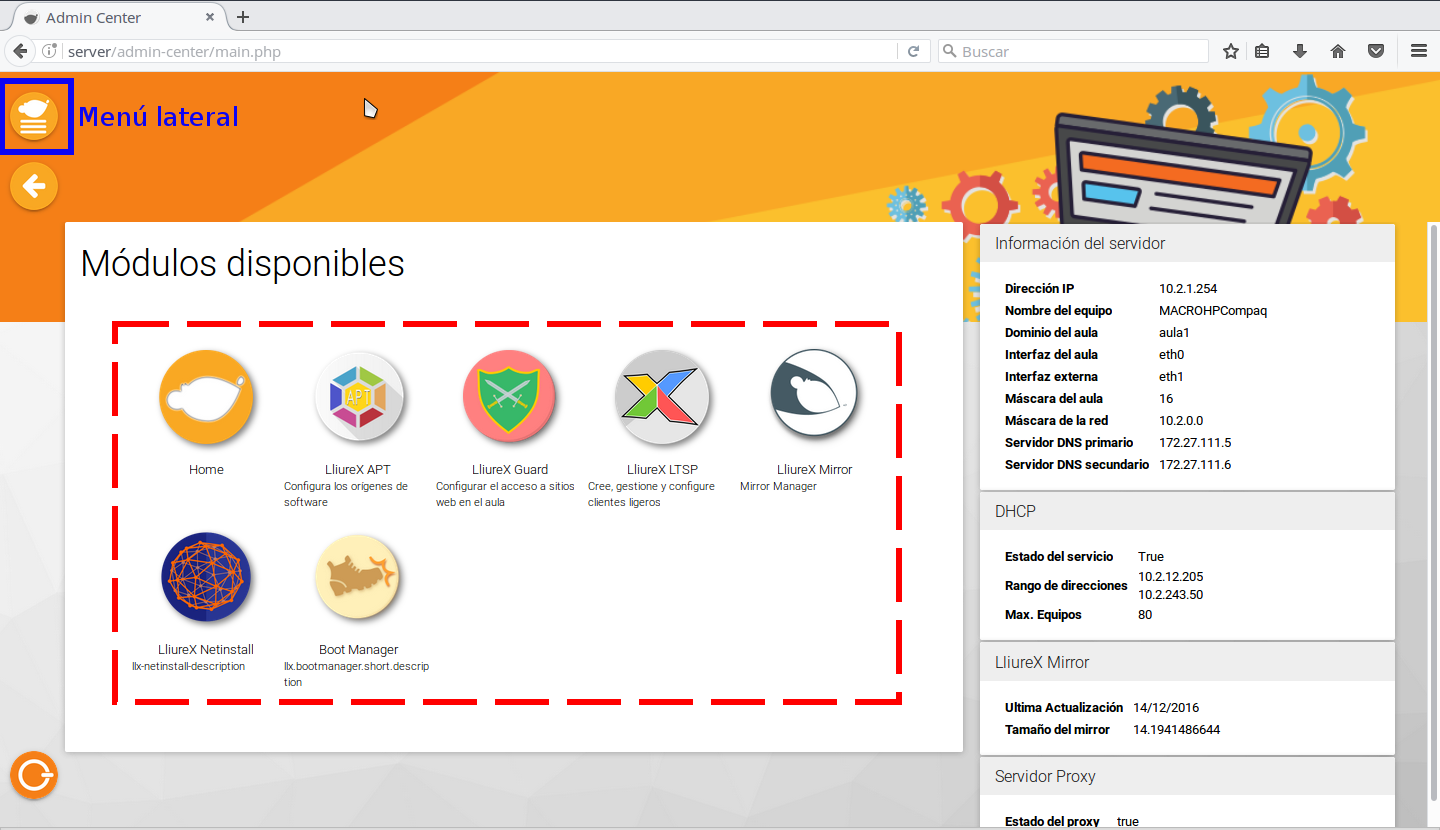 Una de las novedades con que se presenta la versión de LliureX 16 es la gestión del servidor a través de una aplicación web accesible desde cualquier parte del centro. Para acceder hay que escribir sobre la barra del navegador localhost. De esta manera podremos entrar al nuevo sistema de administración «admincenter» clickando sobre Centro de administración.