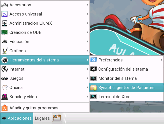 Para acceder a ésta tenemos que abrir el menú Aplicaciones -> Herramientas -> Synaptic, gestor de paquetes.