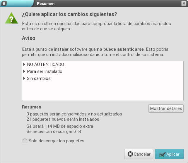 Es entonces cuando los paquetes cambian el estado (se muestra como seleccionado). Ahora tenemos que aplicar los cambios (para que realice la instalación) mediante la pulsación del botón Aplicar (de la barra de herramientas superior), lo que hace que se muestre un diálogo con los paquetes que se van instalar/actualizar, así como el espacio que ocupan.