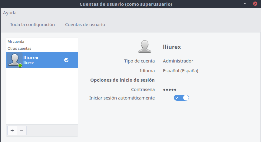 Hecho esto si en el menú escribimos "usuari" se mostrará la opción Cuentas de usuario que permitirá cambiar la opción de autologin.