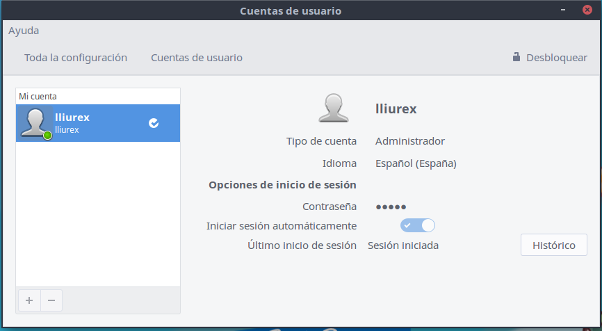 Si se utiliza esta opción, para poder cambiar la opcion de autologin, primero habrá que hacer clic sobre Desbloquear y una vez introducida la contraseña se podrá modificar la opción.