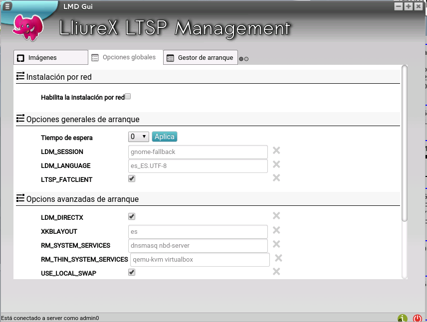 LMD ofrece un conjunto de pestañas que contienen diversas opciones para poder configurar algunos parámetros interesantes tanto del menú de arranque, como de las plantillas y del propio arranque de los clientes ligeros.