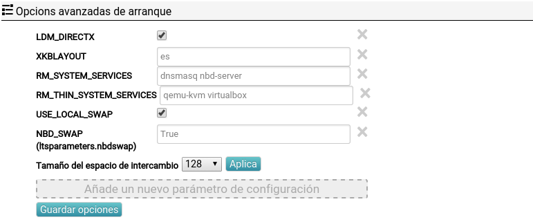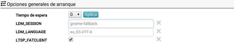 - Opciones generales de arranque: esta sección contiene los parámetros más comunes de arranque de LTSP como son: