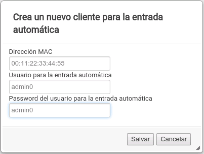 Pulsando el botón, se mestra un diálogo donde debemos introducir: la dirección MAC del cliente, así como el usuario y la contraseña para la entrada automática (este usuario ha de estar dado de alta en el LLUM).