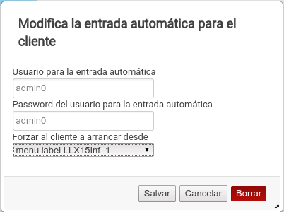 En caso de querer modificar alguno de los parámetros que hemos fijado o borrar la configuración, debemos hacer doble clic sobre el cliente. Es entonces cuando se abre un diálogo donde, además de los datos que hemos introducido, aparece un desplegable nuevo que muestra las diferentes posibilidades de arranque que podemos aplicar. Si seleccionamos alguna de ellas, el cliente arrancará automáticamente la entrada de menú seleccionada.