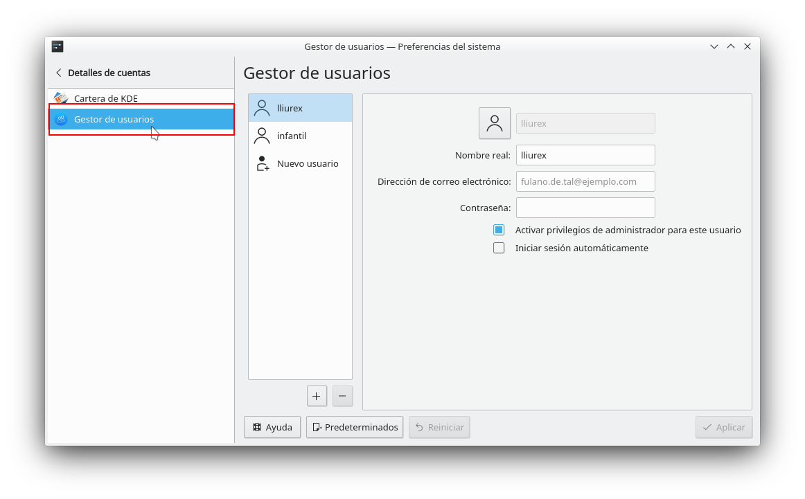 Para configurar el inicio automático de la sesión una vez dentro del Gestor de usuarios se seleccionará de la lista de usuarios locales el usuario con el que se desea acceder de forma automática y a continuación se marcará la opción de Iniciar sesión automáticamente y se hará clic en Aplicar para guardar los cambios