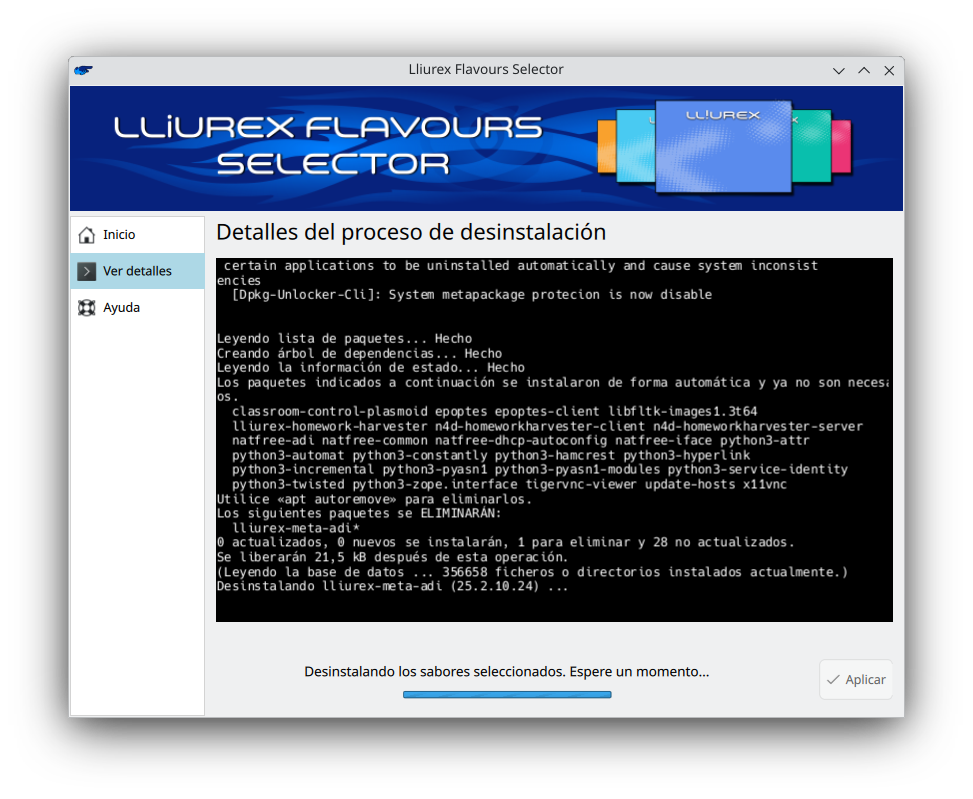 Una vez se haya configurado los sabores a instalar y/o desinstalar en el equipo se hará clic en Aplicar. Al hacerlo aparecerá una ventana donde se mostraran los cambios que van a realizarse en el sistema. En el caso de desinstalar algún sabor se podrá marcar la casilla para que se desinstalen también otros paquetes que ya no son necesarios permitiendo limpiar el sistema.