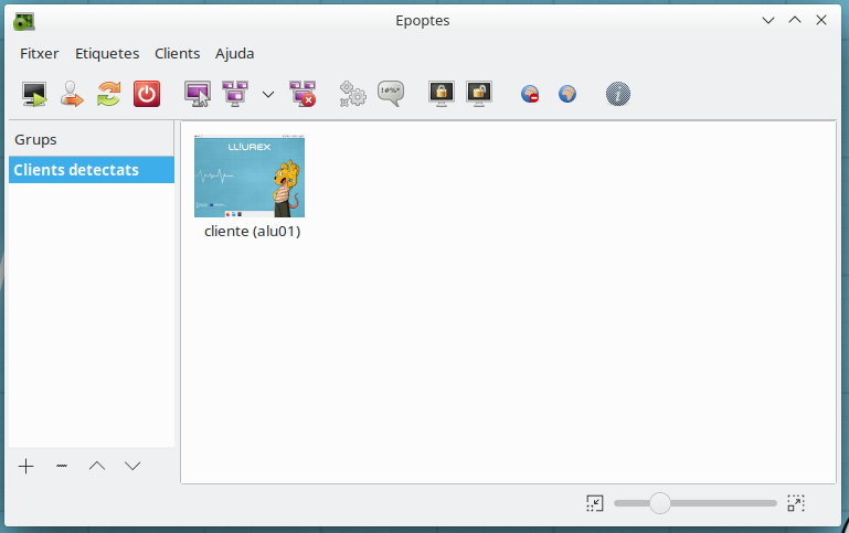 Si un client encara no ha iniciat sessió (com és el cas de la captura anterior), és a dir, l'alumnat no ha introduït el seu usuari i la contrasenya, l'Epoptes no pot mostrar l'escriptori d'aqueix usuari i el que es veu és un ordinador xicotet que mostra, en la pantalla, el tipus de client (lleuger o pesat) que arrancarà quan l'alumnat s'identifique. En cas contrari, es mostra l'escriptori de l'alumnat en miniatura, així com l'usuari amb què s'ha iniciat sessió (en el missatge que es mostra davall de la captura).