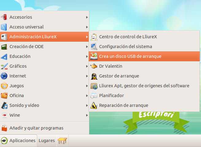 En las versiones 13.06 y 14.06 de LliureX, la herramienta para crear el USB de arranque se encuentra disponible en el menú Aplicaciones > Administración LliureX > Crea un disco USB de arranque.