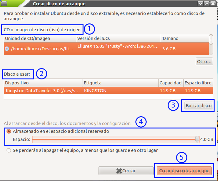 - Reservamos el espacio deseado para permanencia de datos, el sistema le pondrá un límite relacionado con la capacidad de nuestro USB. Es recomendable reservar algo de espacio para permanencia, de esta forma cuando trabaje usando el Live USB podremos guardar nuestros documentos y tener éstos disponibles la siguiente vez que iniciemos sesión usando el USB de arranque.