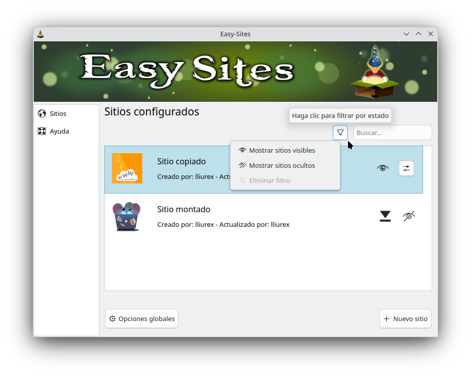 • Estado: para indicar si queremos que por defecto el sitio este visible o no en la página principal del Easy-Sites en el navegador.