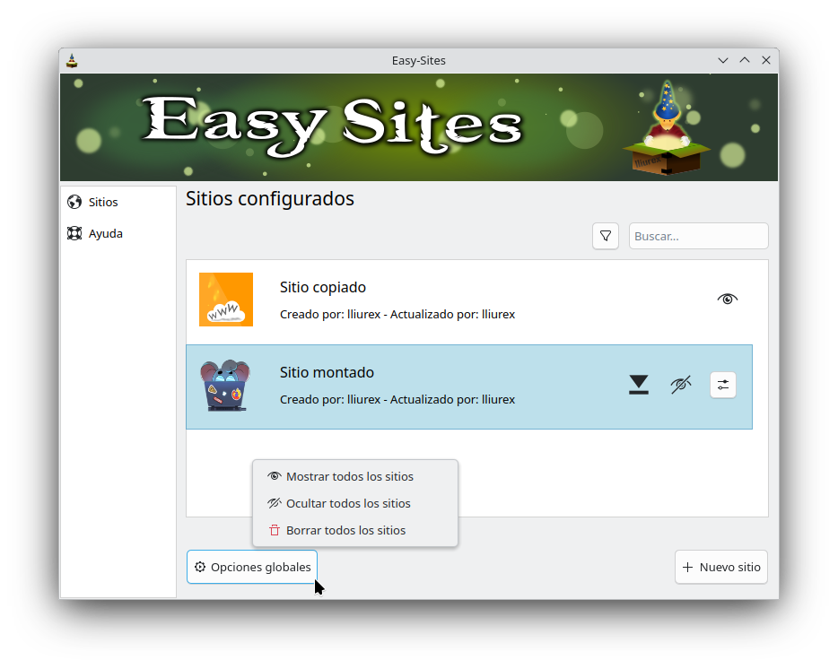 • Ocultar todos los sitios: permite ocultar todos los sitios por que estos no se mostrará en la página del Easy-Sites