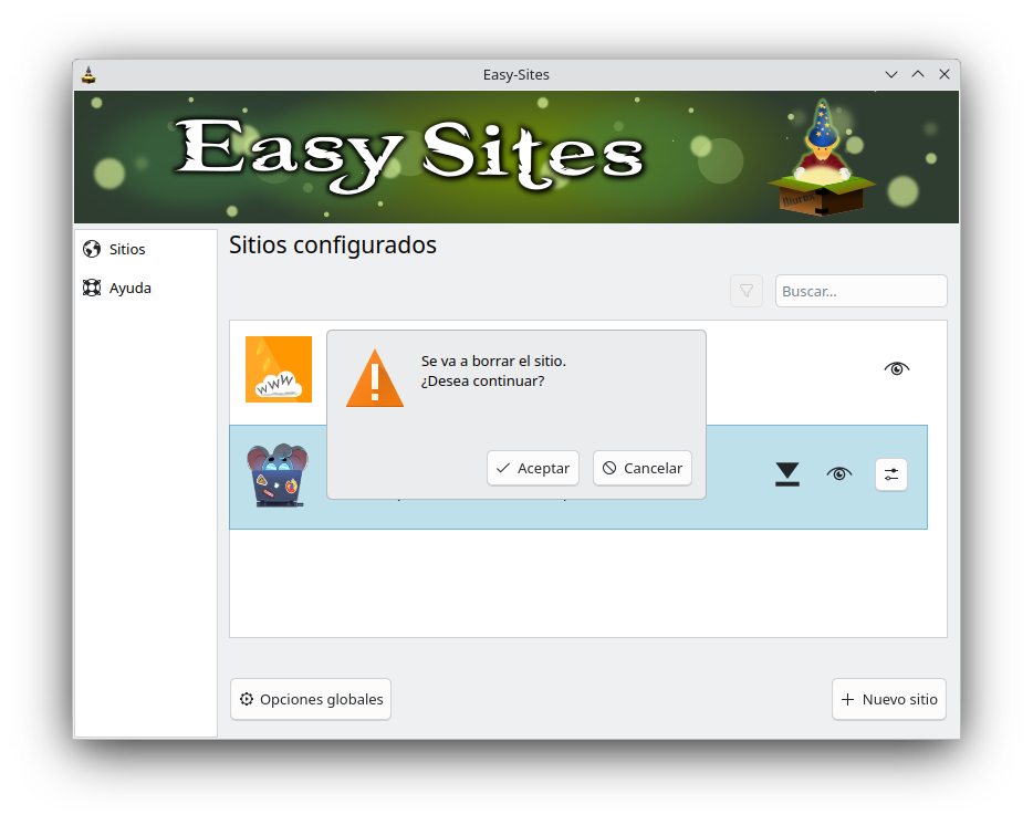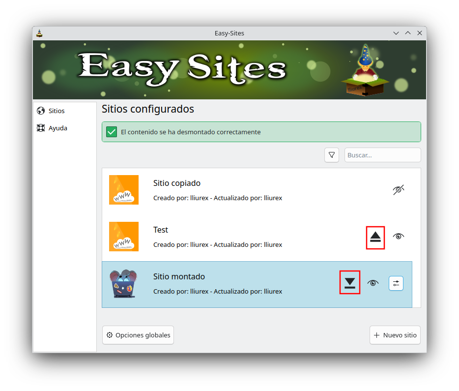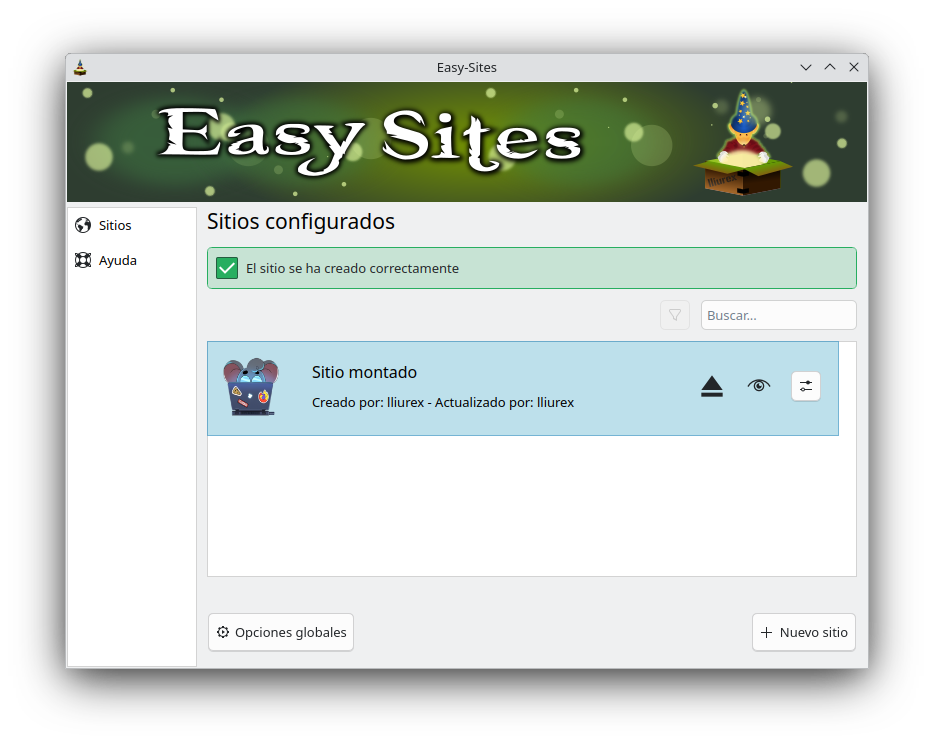 Una vez creado un sitio es posible administrarlo desde la ventana principal de Easy-Sites. Para ello se seleccionará el sitio que se se desea administrar (situando el puntero del ratón sobre el mismo).