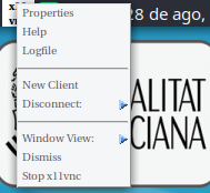 Aquí seleccionaremos las opciones de Acceptar conexiones y escribimos una contraseña para las conexiones entrantes. Esta ventana podemos cerrarla, en la barra de notificaciones podremos ver el icono de X11VNC. Si pulsamos sobre el botón derecho nos aparecerá un menú donde podemos cerrar la conexión: