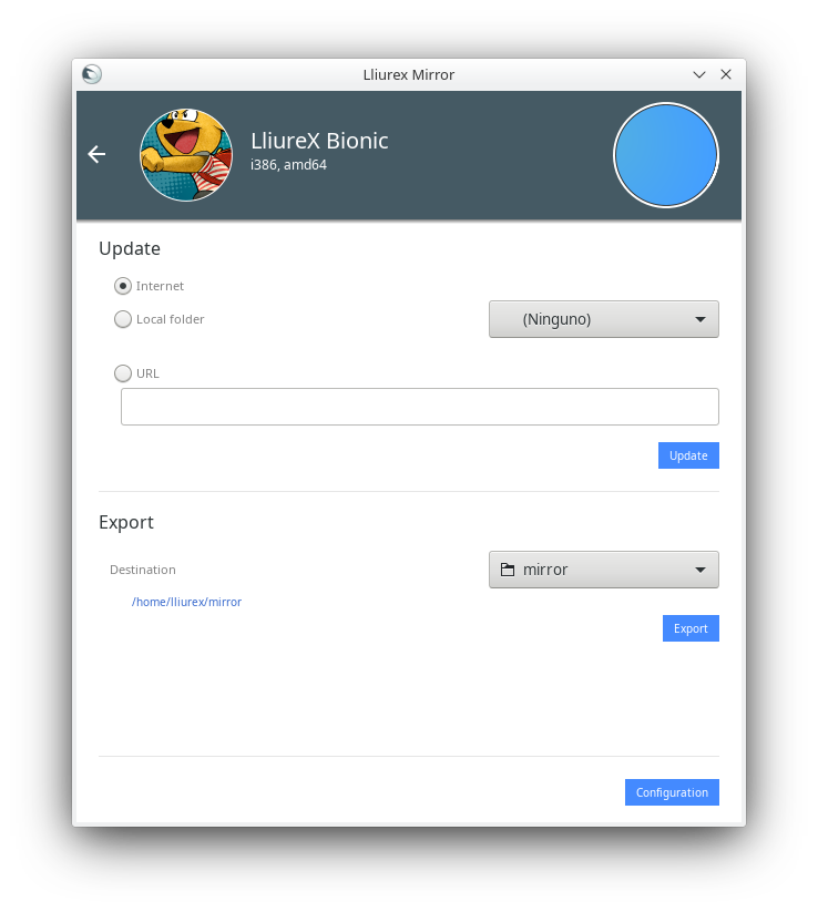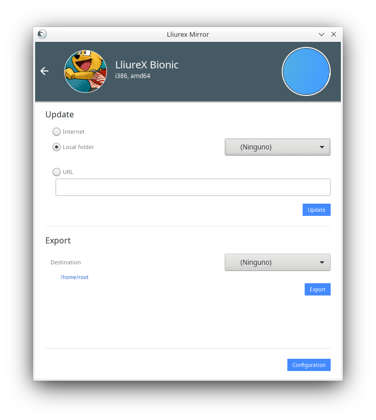 Para importar el mirror deberemos entrar Lliurex Mirror, seleccionar la carpeta donde se encuentra el mirror exportado e importar (opción Local folder) y hacer clic en Update