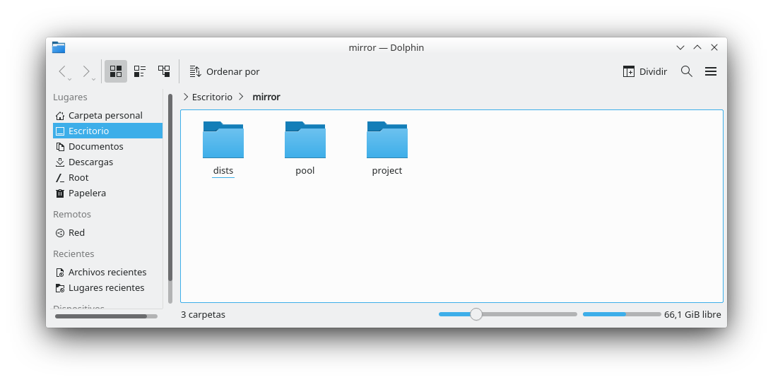 Una vez haya terminado la copia podemos ver que se han creado tres carpetas (dists, pool, project), estos archivos los podemos copiar a un pendrive o compartirlos a través de la red para poder importarlos en otro servidor.