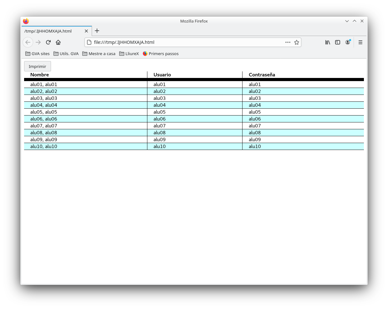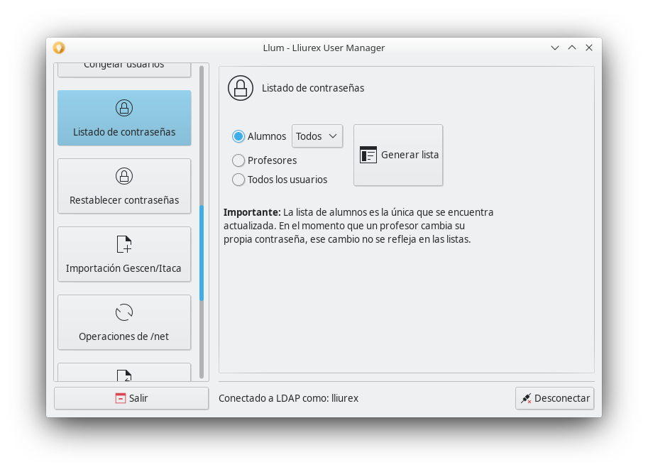 Tras seleccionar las opciones, pulsamos el botón Generar lista y se genera el listado que contiene el nombre, el usuario y la contraseña. Éste puede ser imprimido, pulsando el botón Imprimir, para ser consultado más tarde.