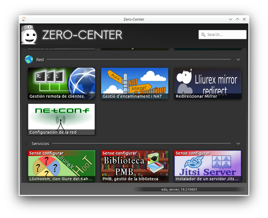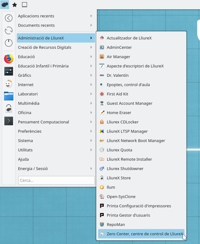Aquesta aplicació ve instal·lada per defecte en tots els servidors, per la qual cosa podem accedir-hi a través del Centre de control de Lliurex, al menú Aplicacions -> Administració de LliureX -> Zero Center, centre de control de LliureX.(la imatge pot variar en funció de la versió de *LliureX o de la personalització aplicada per l'usuari)