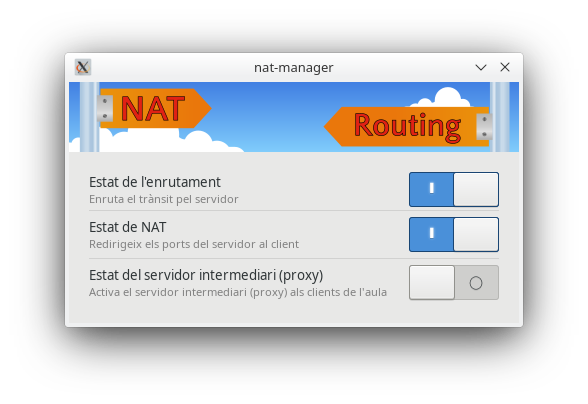 Per a habilitar i inhabilitar el el servidor intermediari (proxy) utilitzant aquesta aplicació és necessari que les opcions d'encaminament i NAT estiguen activades.